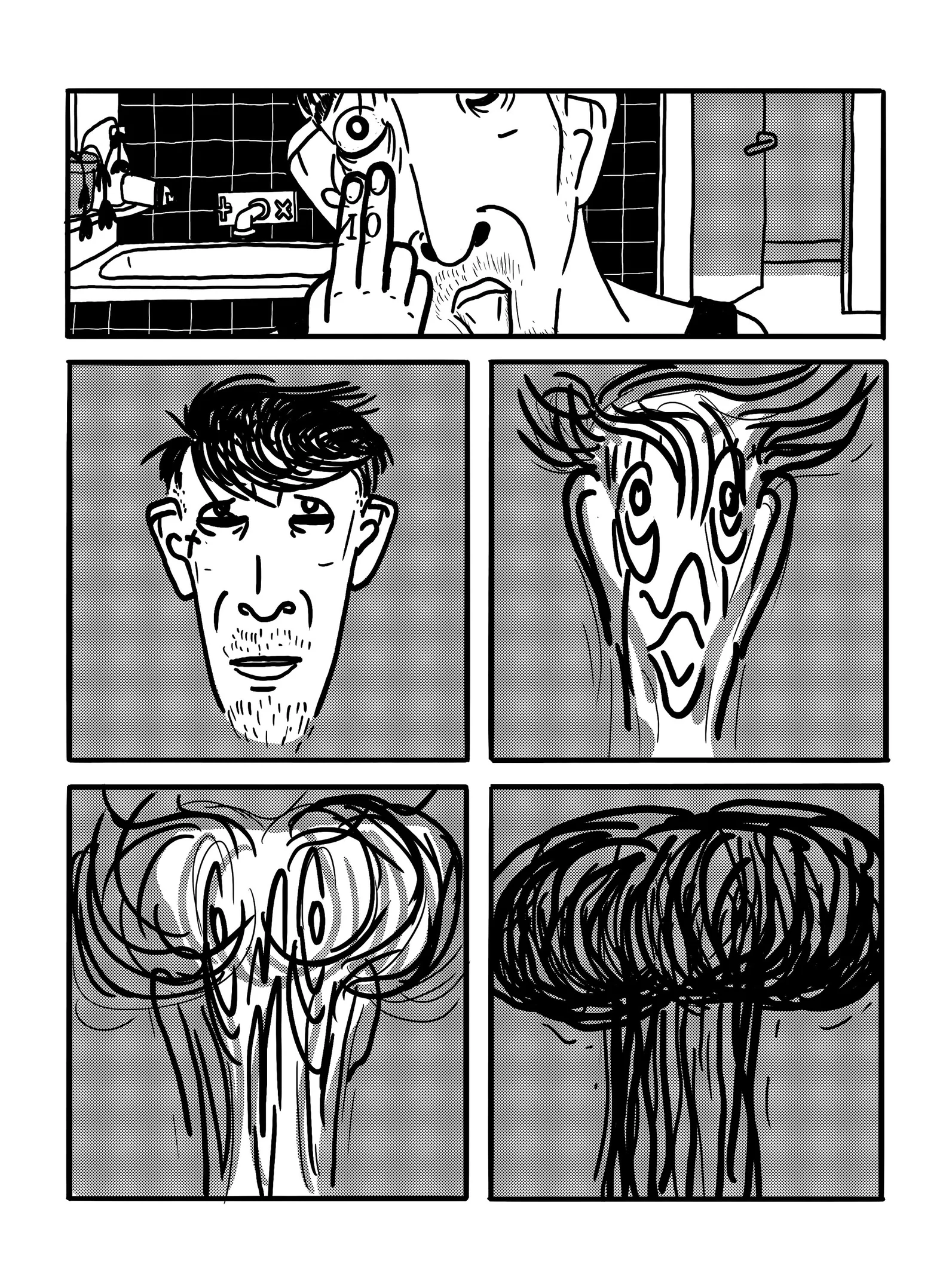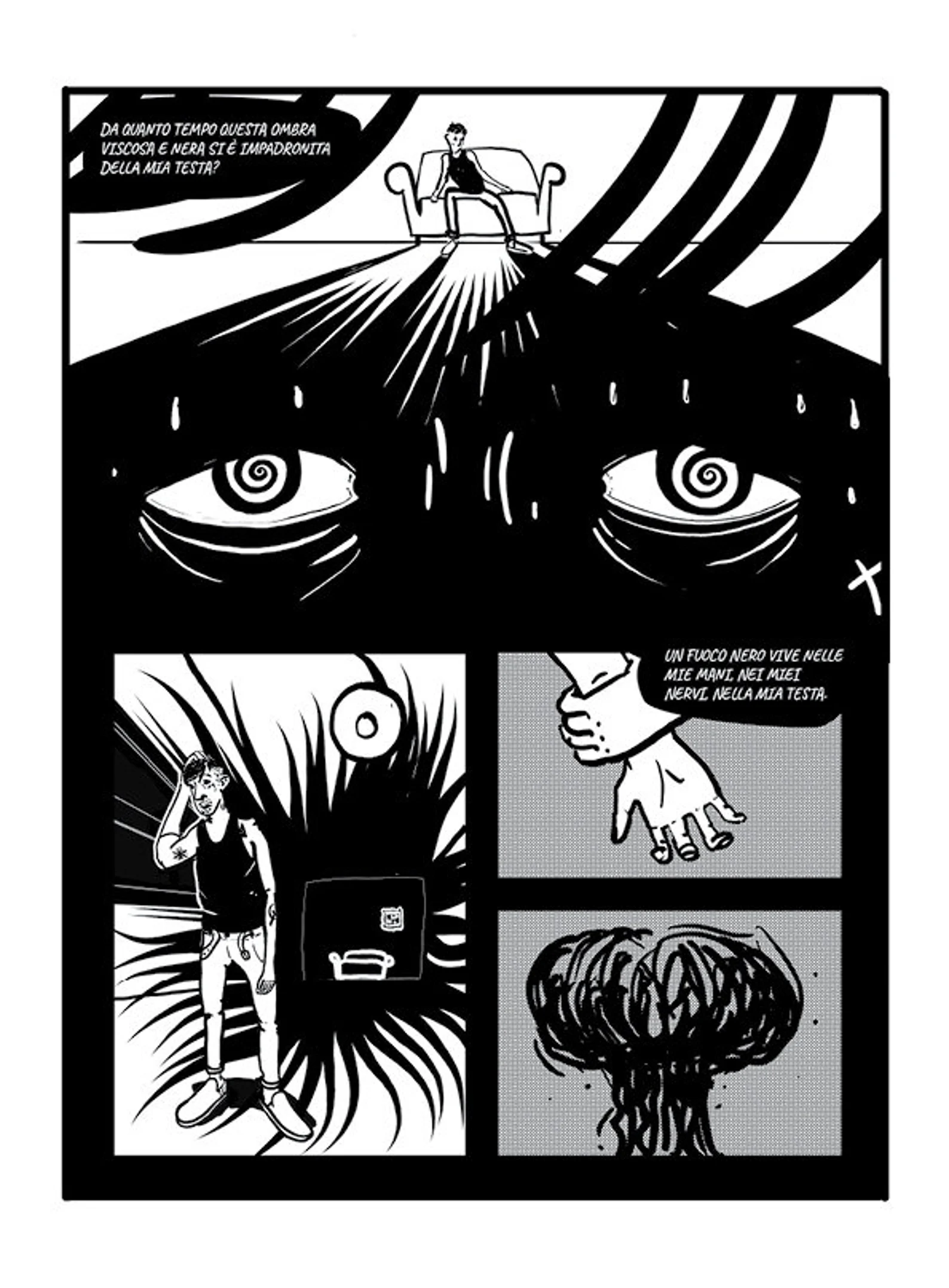 Krátký komiks blížící se spíše hudebnímu videu než tradičnímu příběhu. Několik scén, velmi málo dialogů, vždy stejných, a jediná dvourozměrná postava, která se snaží osvobodit z temné stagnace, nebo tak to alespoň vypadá. Sebedestruktivní punkrockový podtón spojuje surrealistický, rozpadlý proud obrazů, které netvoří příběh, ale podivnou černou bublinu inkoustu a chaosu.