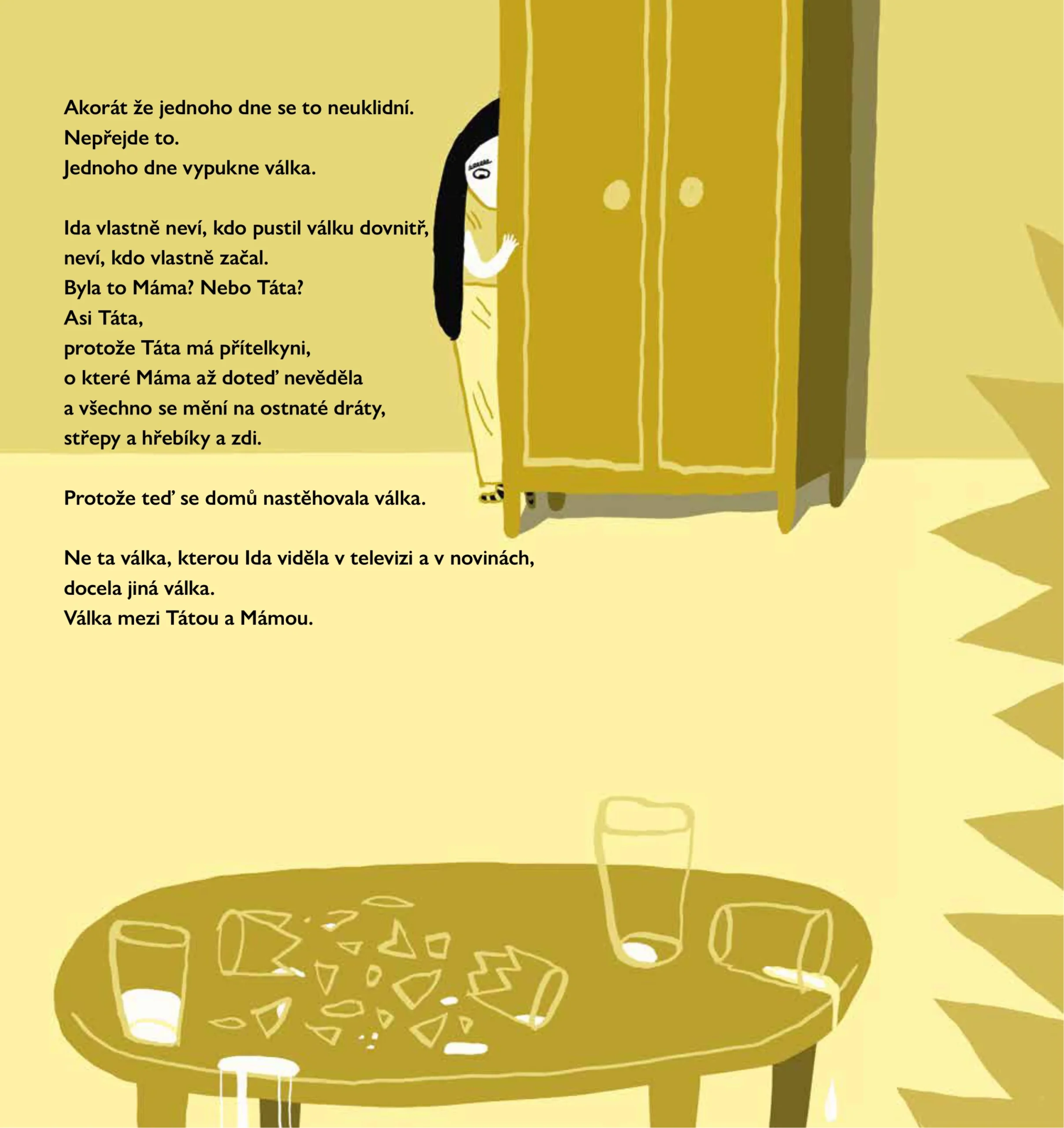 Ida zná válku z obrázků v novinách, z televize zná zvuky výstřelů a padajících bomb. Ida naštěstí bydlí v zemi, kde se neválčí a kde dokonce ani vosy nejsou nebezpečné. Když ale válka přijde blíž, když spolu začnou válčit táta s mámou, promění se Idin svět v bojiště, na kterém platí úplně nová pravidla. Válka je nepřehledná, únavná a plíživě pohlcuje všechno kolem.