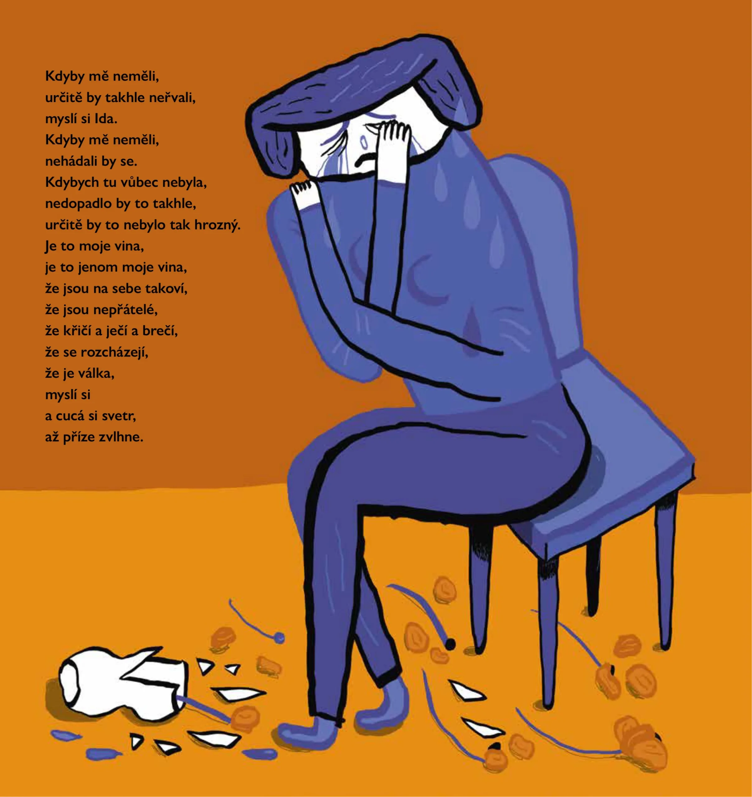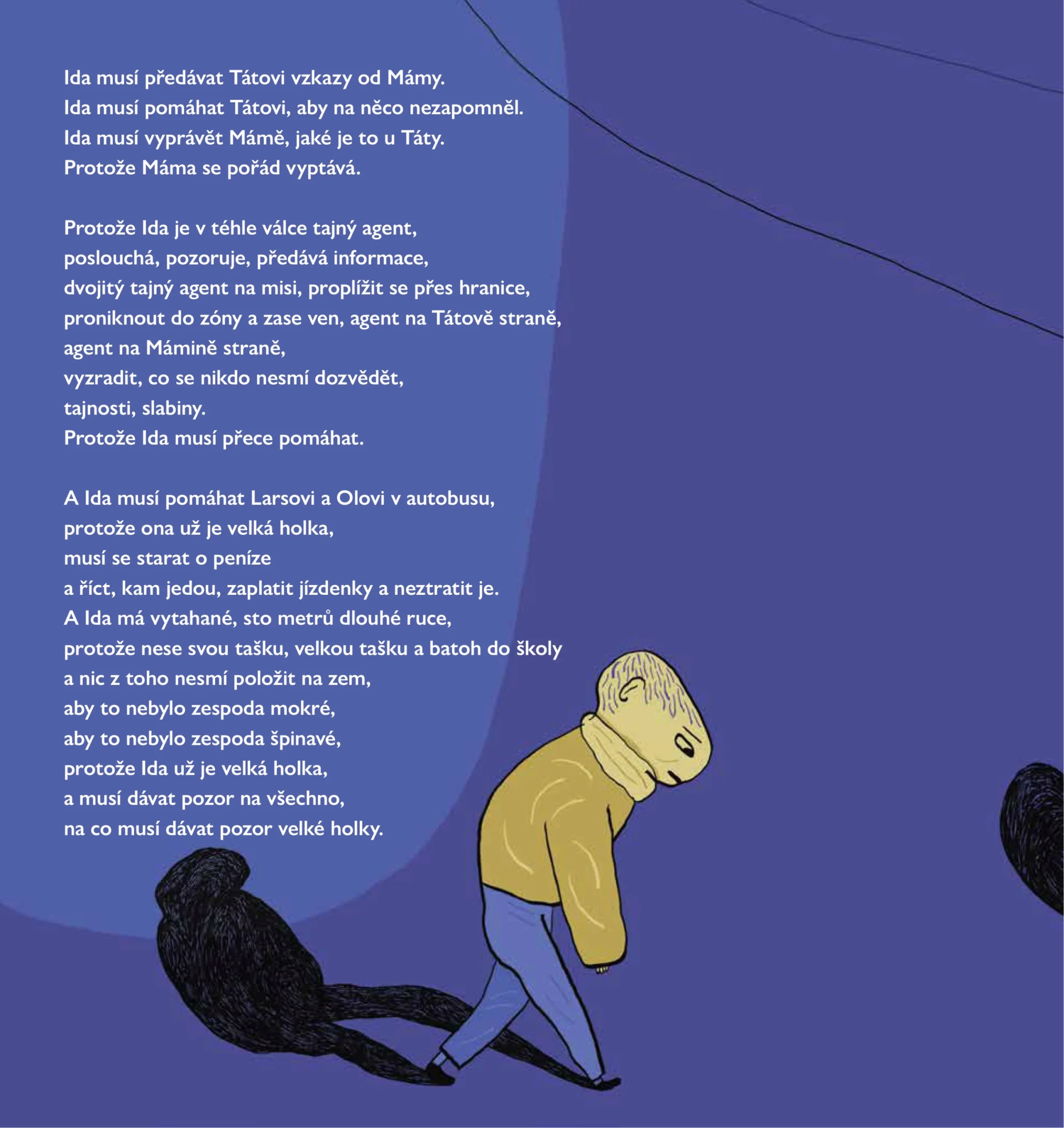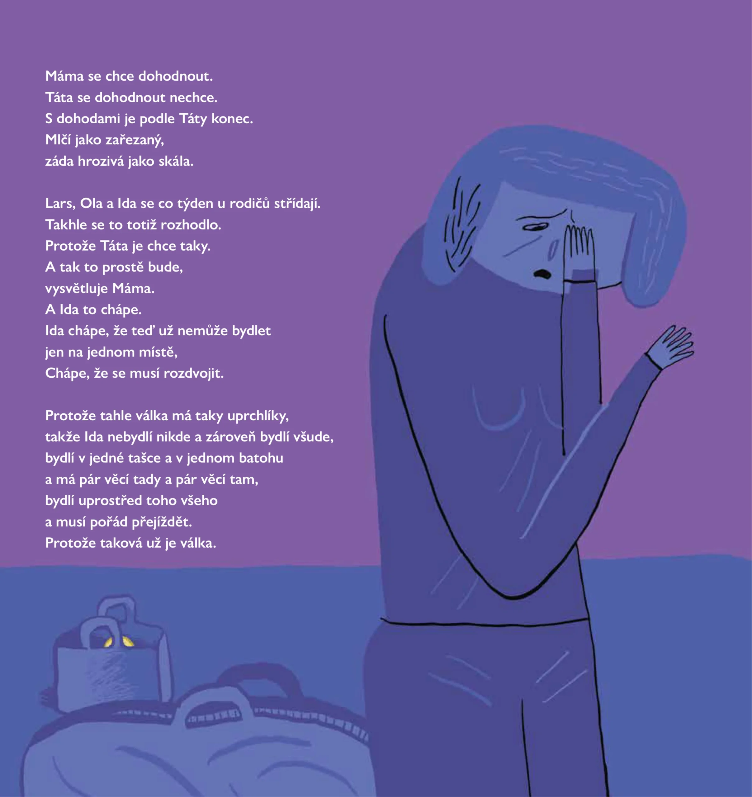 Norská spisovatelka Gro Dahle bere děti vážně a má schopnost nahlédnout svět z jejich perspektivy. Její poetický jazyk kontrastuje s naivistickými, ale zároveň syrovými ilustracemi její dcery, Kaii Dahle Nyhus. Dá se válka vyhnat z těla, ve kterém se zabydlela? A mohou se všichni ti, které válka poznamenala, cítit zase dobře?
